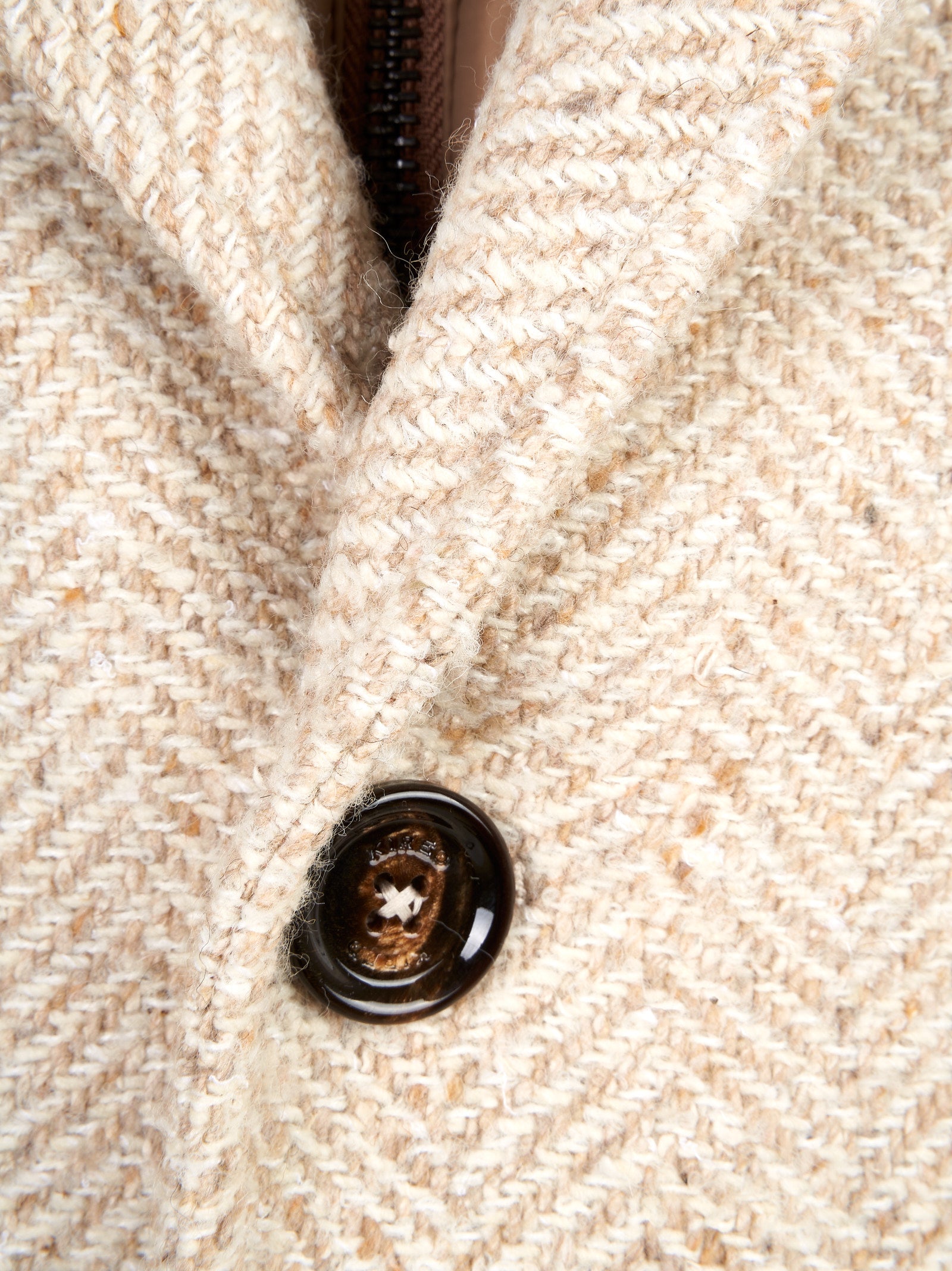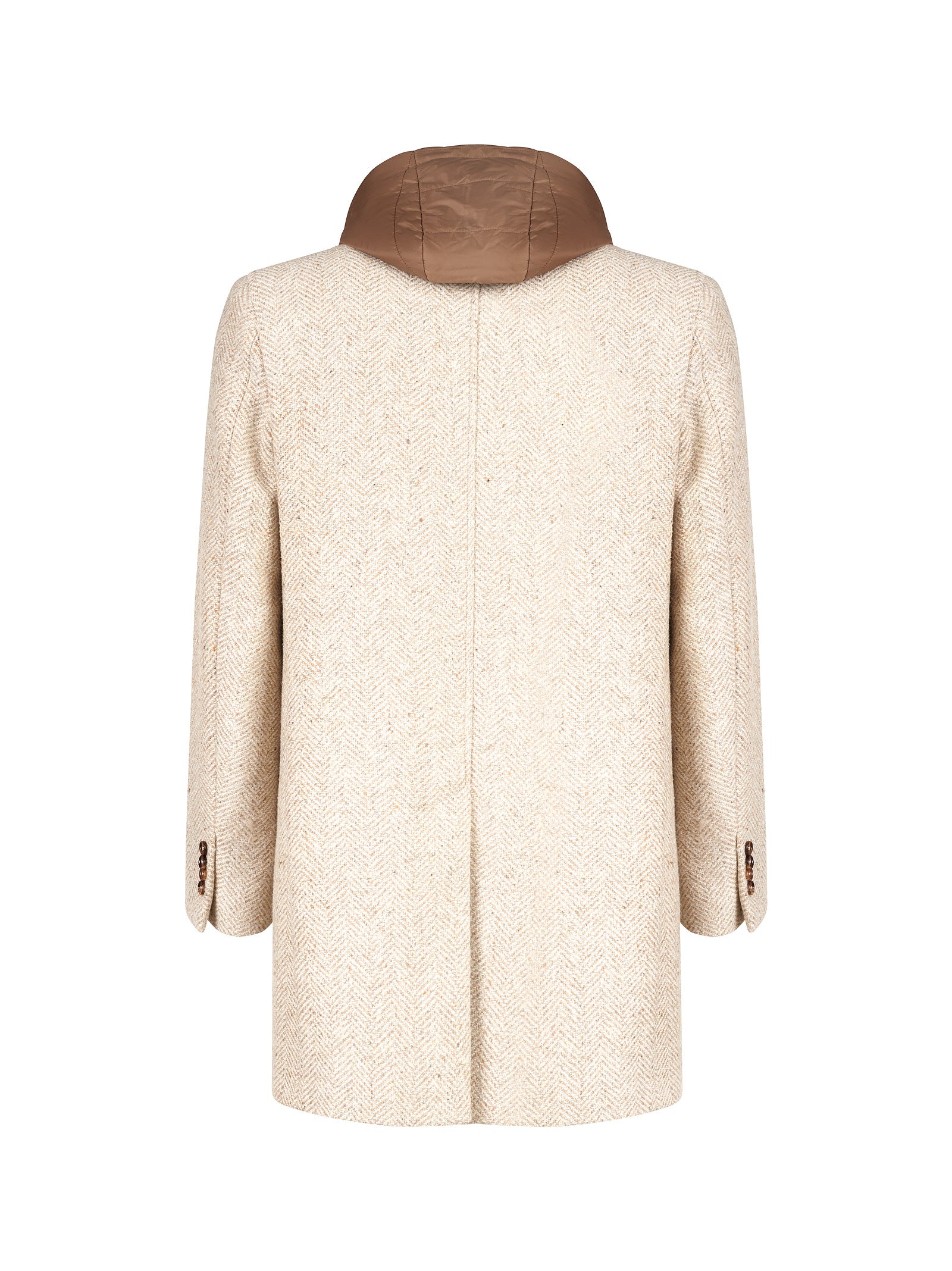 Dettaglio: Cappotto monopetto realizzato in lana spigata effetto melange. Dotato di pettorina interna in nylon e cappuccio applicato. Chiusura con preziosi bottoni in corno. 46% polietilenica 30% lana 20% poliestere 5% altre fibre Made in Italy