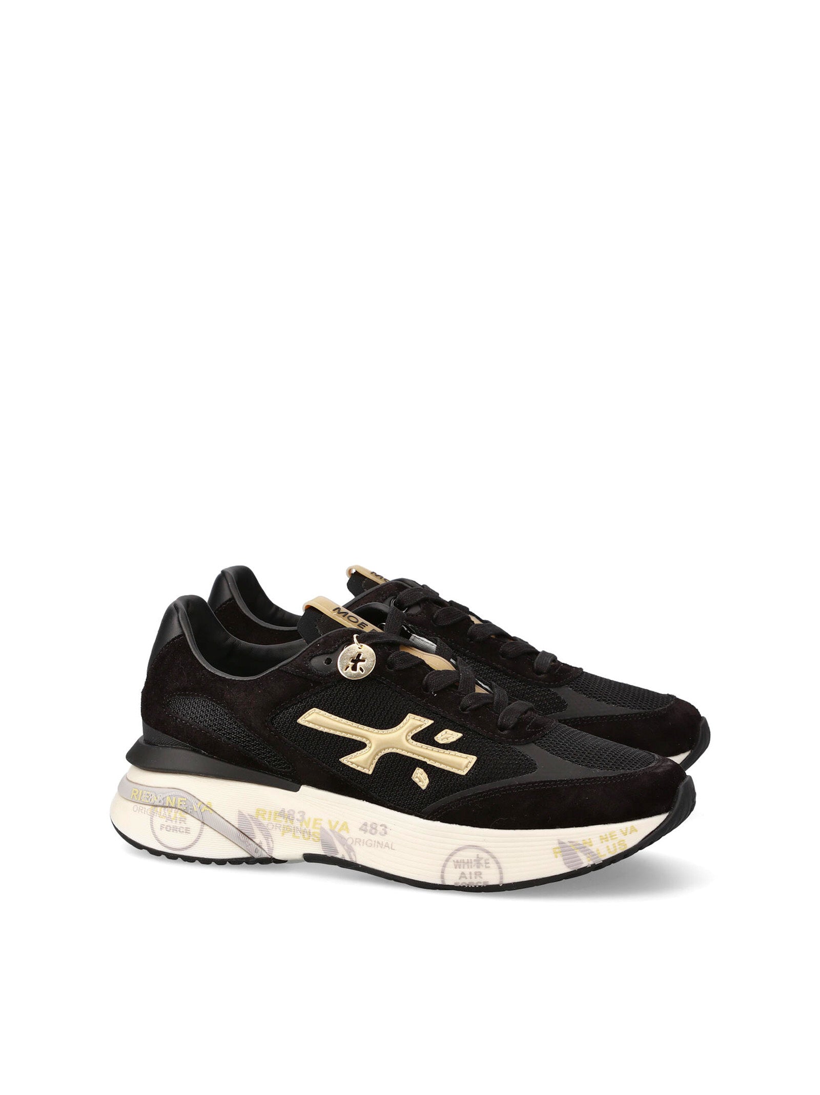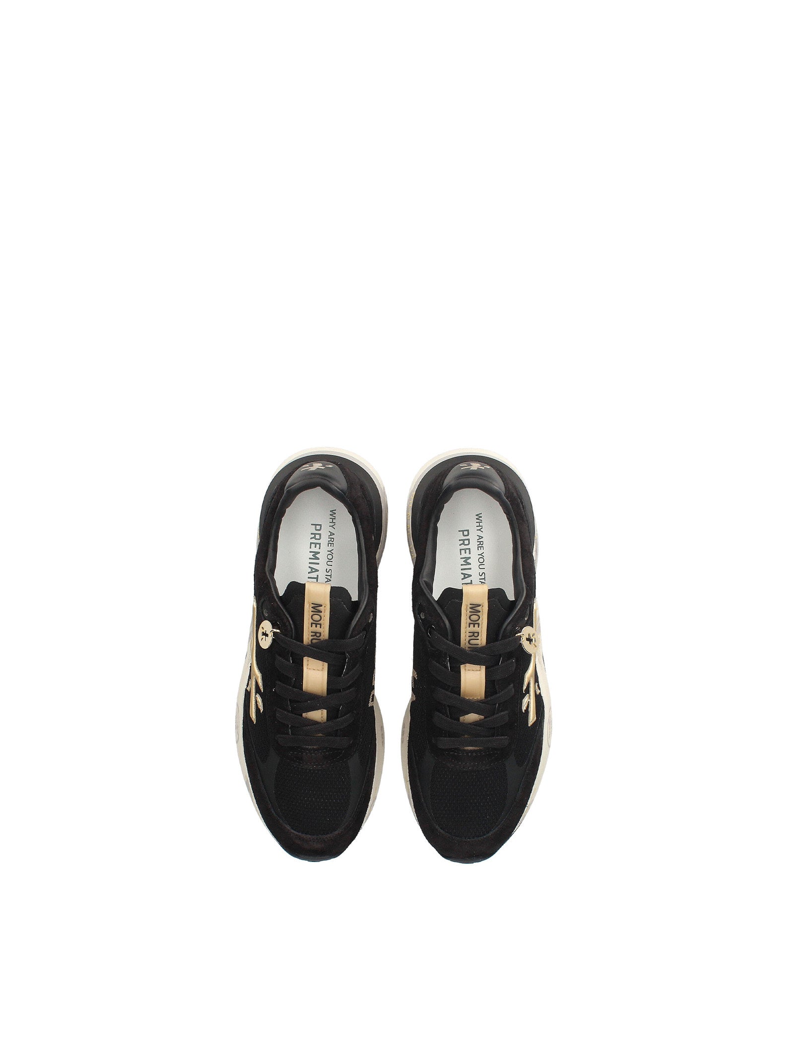 Dettaglio: Ideate per stupire. La Moerun si basa sulla leggerezza del movimento, la stabilità e la sensazione ammortizzante data dall'innovazione del fondo. La nuova silhouette è ricca di dettagli: logo sul laterale esterno, scritta PREMIATA sul laterale interno e nome del modello sull'etichetta.